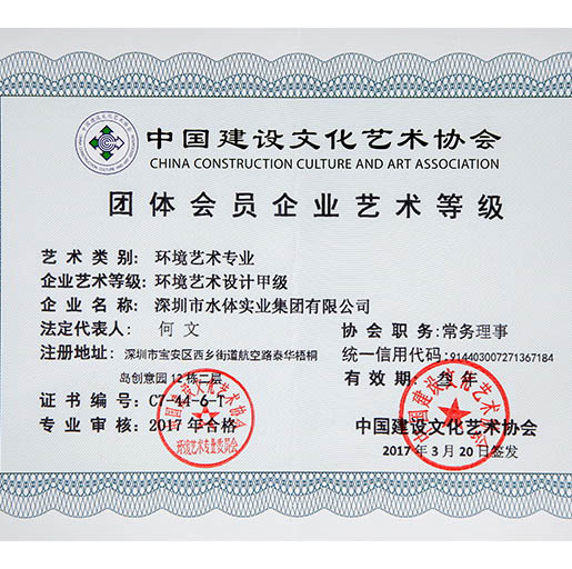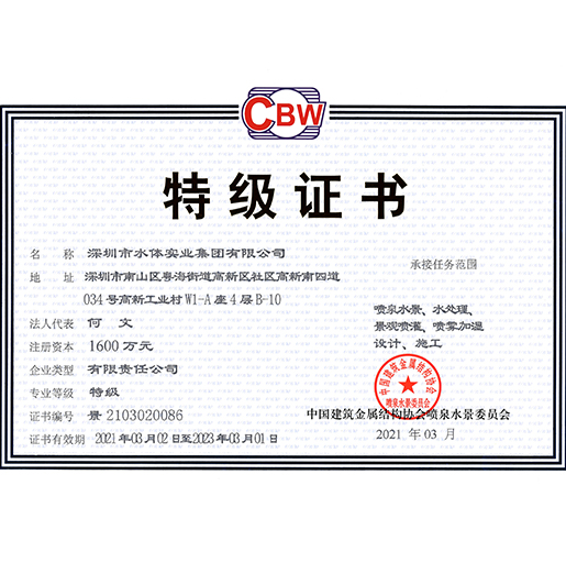 水體集團是噴泉界的先驅(qū),是中國華南地區(qū)具實力的噴泉水景專業(yè)公司,是中國噴泉水景委員會副主任單位、中國環(huán)境藝術(shù)委員會常務(wù)理事單位、深圳市《政務(wù)、商務(wù)決策專家咨詢支持系統(tǒng)》定點服務(wù)單位,具備噴泉水景、水處理、景觀噴灌、噴霧加濕、設(shè)計、施工專業(yè)等級,環(huán)境藝術(shù)企業(yè)藝術(shù)等級總承包類、工程類一級、設(shè)計類甲級,城市及道路照明工程專業(yè)承包三級,等等資質(zhì)。