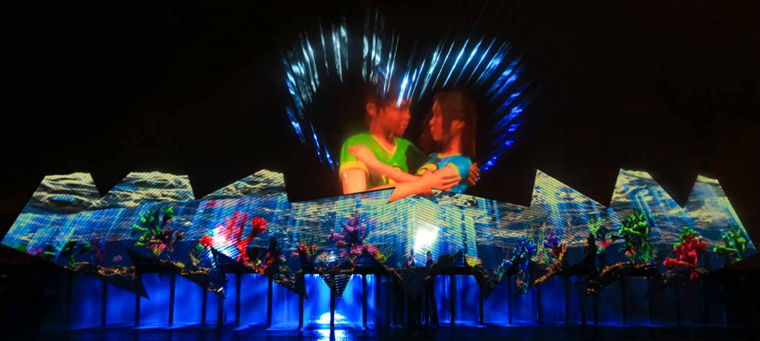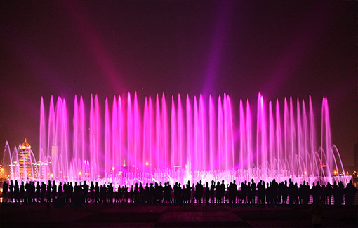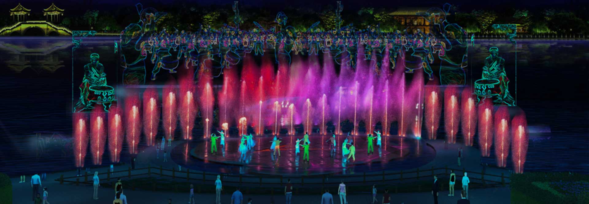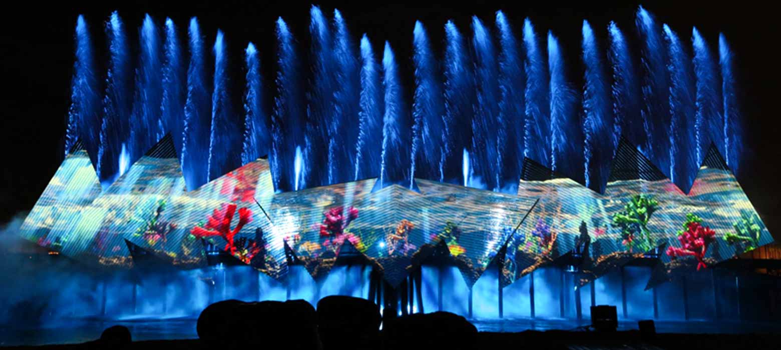 水秀劇場(chǎng)運(yùn)用噴泉、水幕、激光、投影、火焰、音樂、煙火等國(guó)際流行的多媒體藝術(shù)和技術(shù)成果,結(jié)合舞蹈,雜技,服飾表演等水上實(shí)景演出。