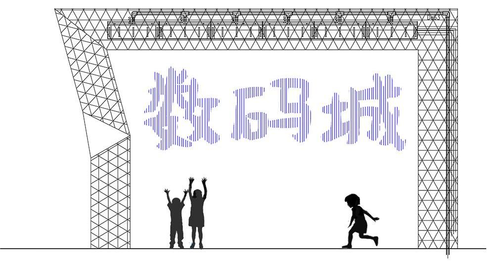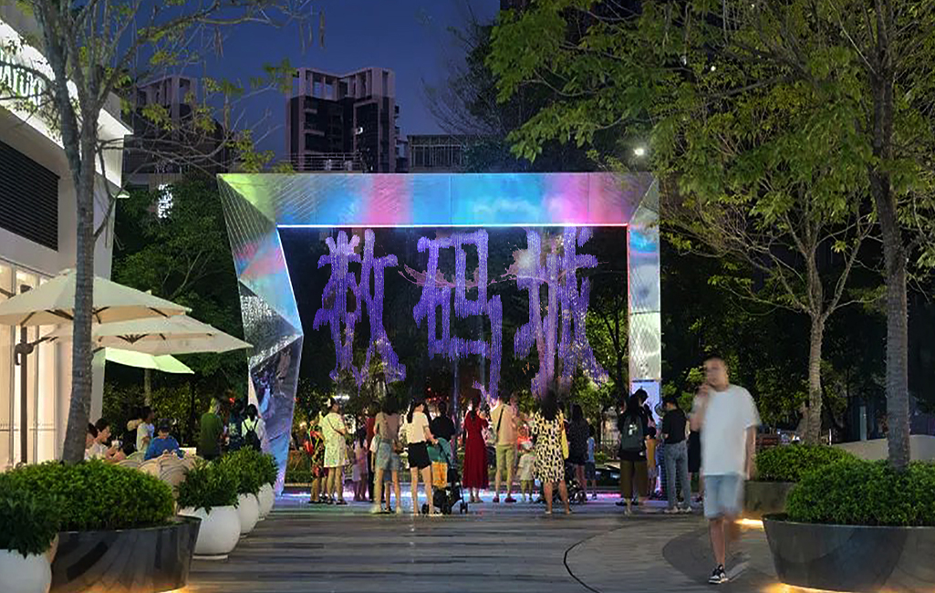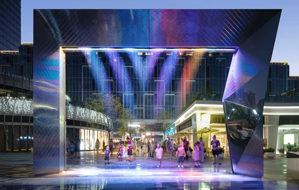 該處水景為天安數(shù)碼城量身定做的數(shù)碼水簾拱門。設計團隊深入了解項目的功能與藝術理念后,從結構安裝細節(jié)里解決了尺度與雕塑的難題。鏡面不銹鋼的材質反射出五彩繽紛的色彩,體現(xiàn)了拱門“