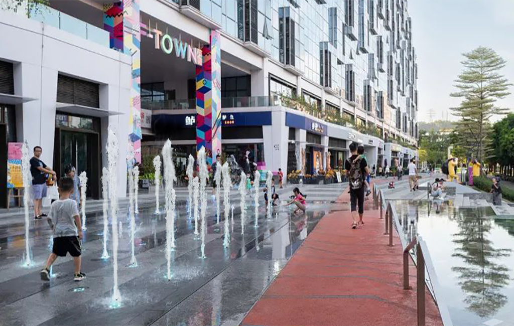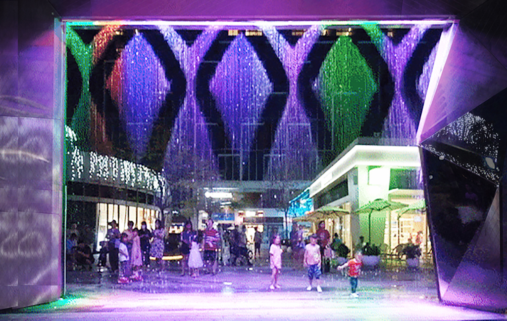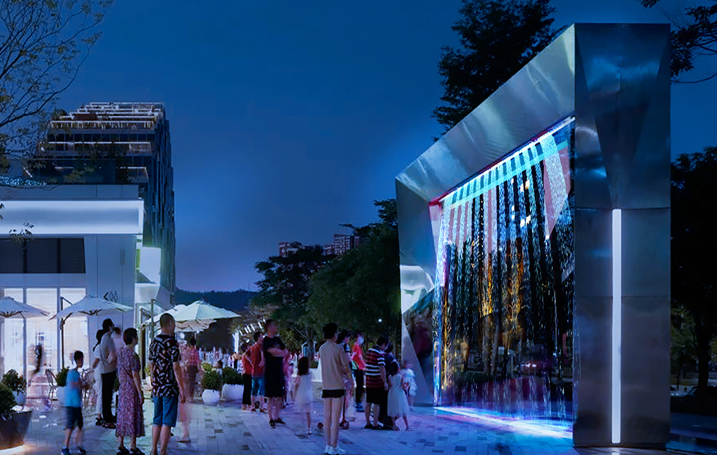 天安數(shù)碼城活力廣場水景由數(shù)碼水簾、旱地噴泉、特色跌水三部分組成,結合了水景功能與新型技術。為天安數(shù)碼城活力廣場增添了無限魅力,活躍了商業(yè)氣氛。