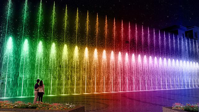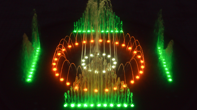 整齊統(tǒng)一的原則還應體現(xiàn)在一個噴泉群體應當有一種控制要素,最常見的控制要素就是高度,對于噴泉來說常在一定位置設立一個高度很大的主噴泉,這就會產(chǎn)生一種強有力的印象,而一些較小的其他噴泉則處于從屬地位,使得觀眾對這個噴泉群體有一個整體的感覺。整體統(tǒng)一還表現(xiàn)在動態(tài)噴泉以一定的周期反復重現(xiàn)某一種形態(tài)的變化,這與前面所述的空間上的整體統(tǒng)一不同,是在時間上的整體統(tǒng)一。