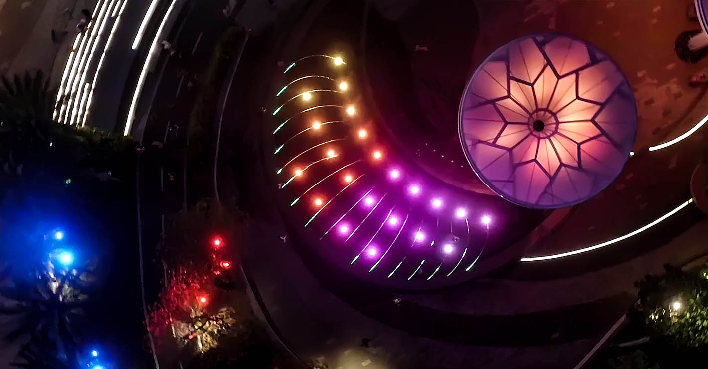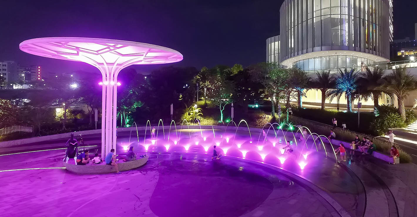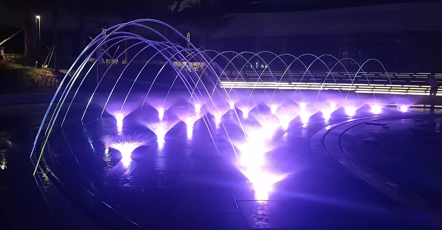 噴泉用變頻波光跳泉、變頻喇叭花、冷霧及燈光裝置組合成彎月形狀,位于天安云谷產(chǎn)業(yè)園極創(chuàng)公園,旁邊有圖書館、藝術(shù)展覽館(ARTECHALL),鬧中取靜,文化藝術(shù)氛圍濃厚,夜景優(yōu)美,周邊吃喝玩樂極為方便。