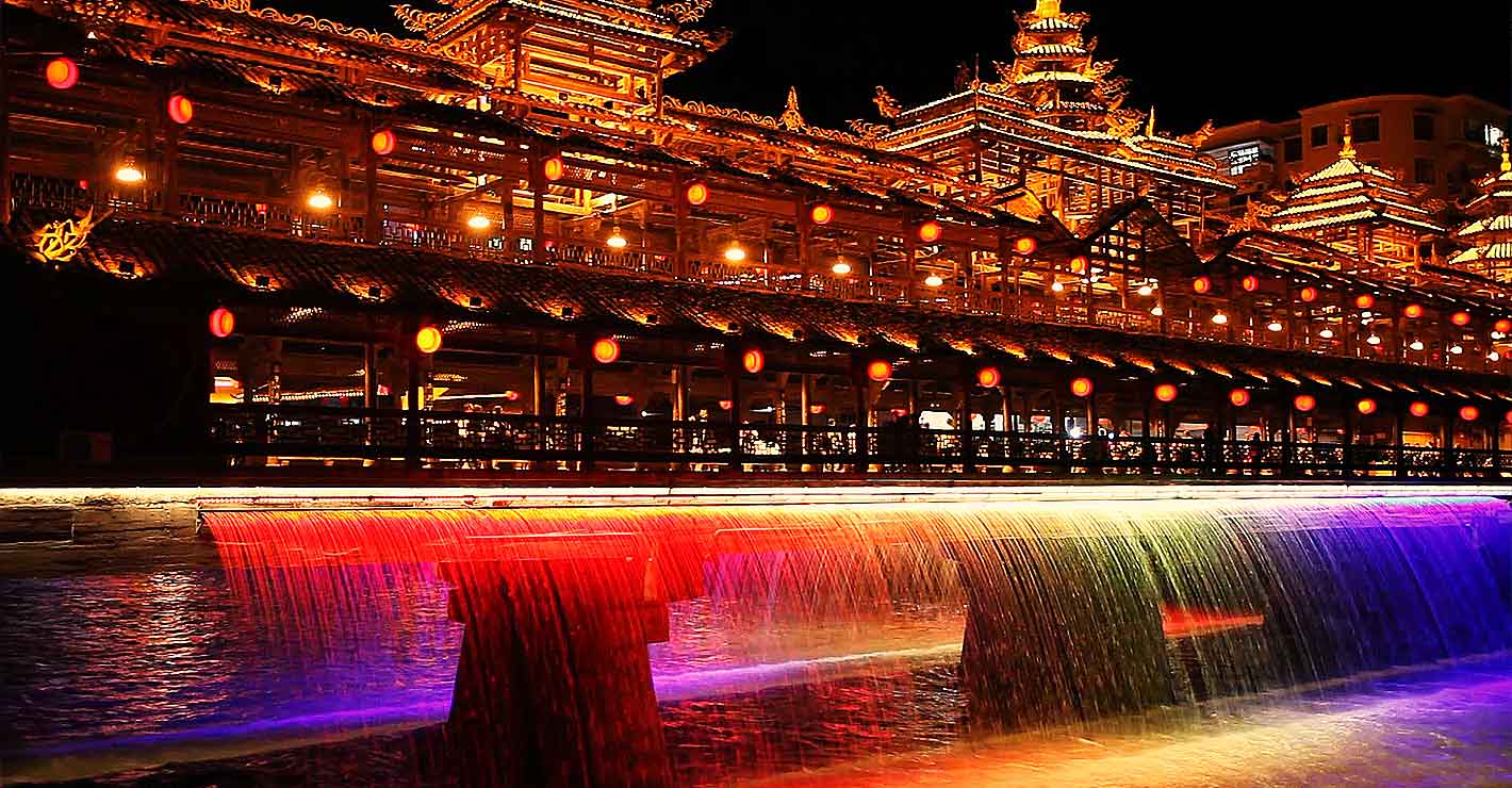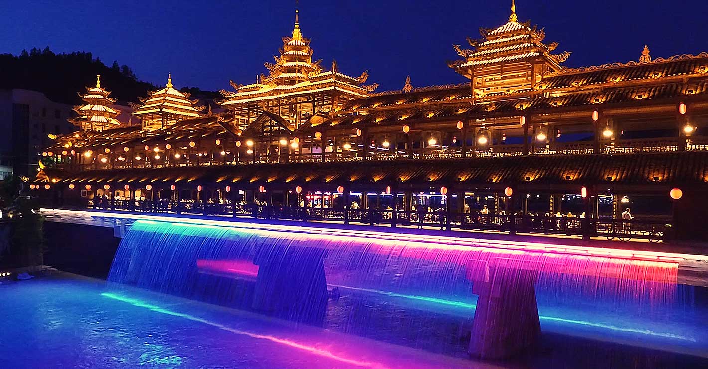 湖北恩施土家族風(fēng)雨橋,此橋已經(jīng)有多年的歷史,是土家族人文化傳承的象征,所以這個(gè)項(xiàng)目更加需要成熟、穩(wěn)定的工藝和技術(shù),才能讓這座橋重?zé)ü獠?。在這座橋上,設(shè)計(jì)橋瀑布,利用直射細(xì)嘴噴頭與LED數(shù)控?zé)艄芙Y(jié)合,形成一道多彩的瀑布,為此橋增添了一抹色彩。